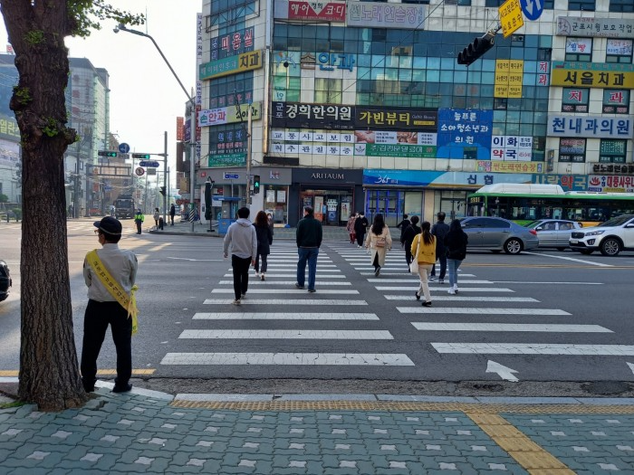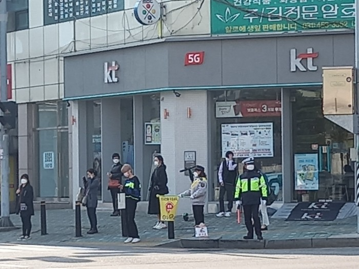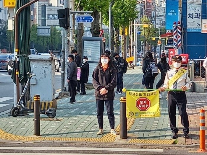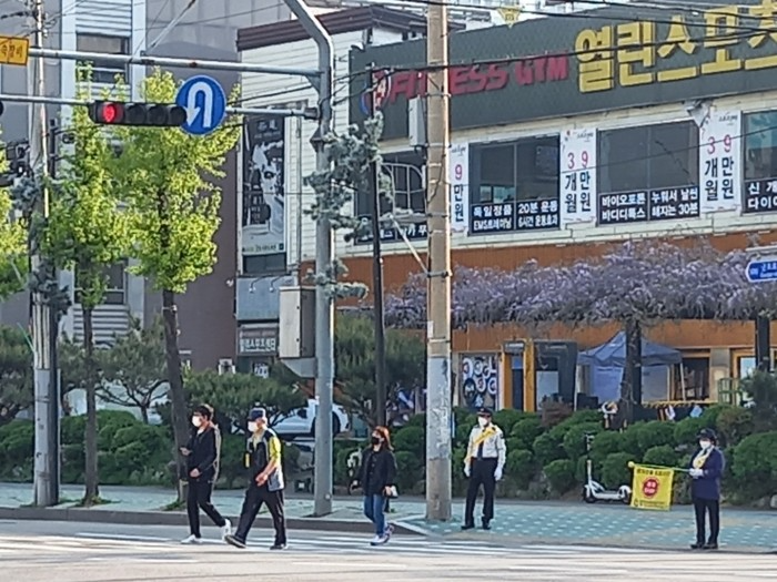 교통봉사대는 마스크 쓰기,발열체크 및 손소독과 사회적거리두기 지침을 준수하며 실시하였다.