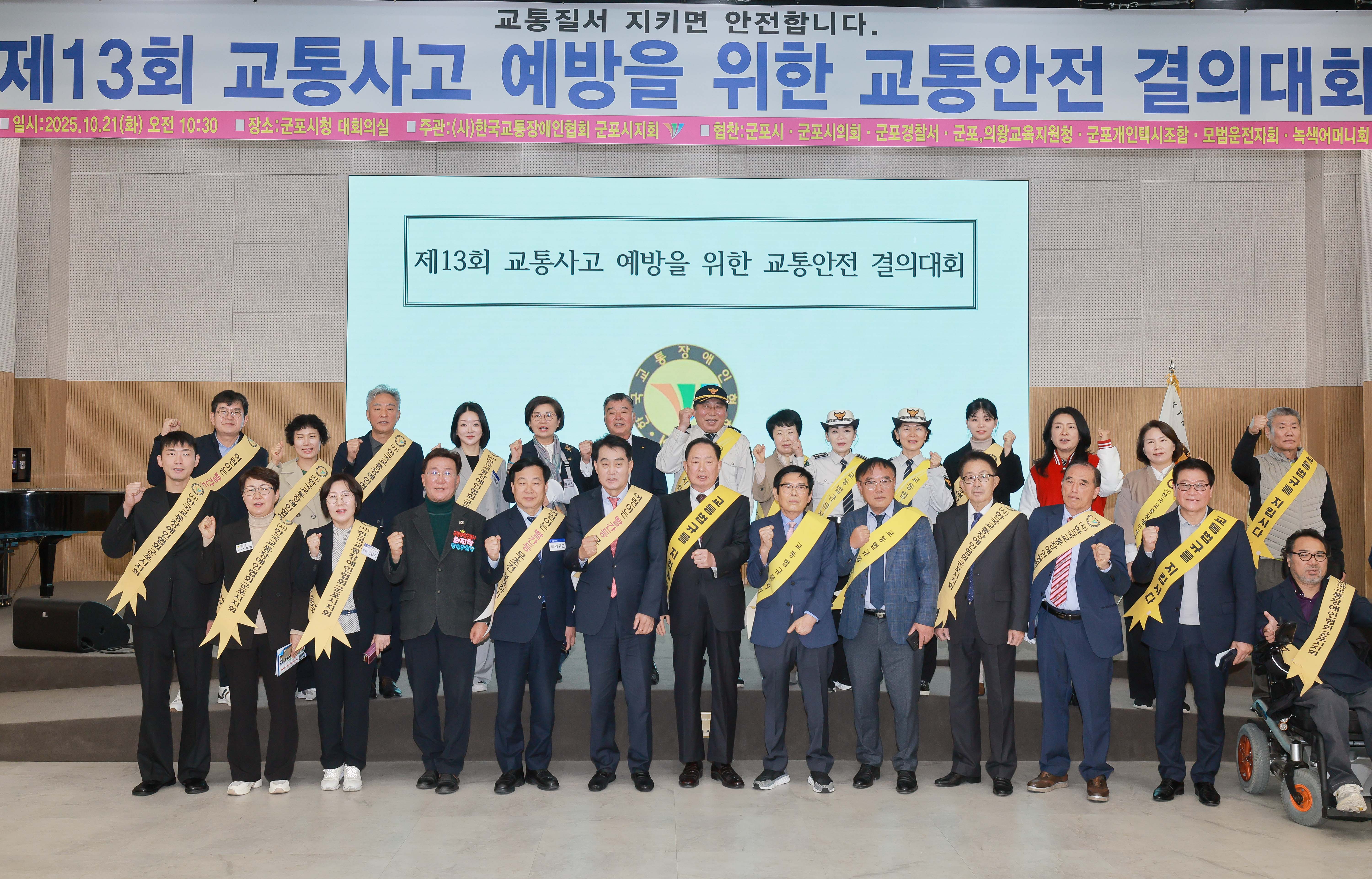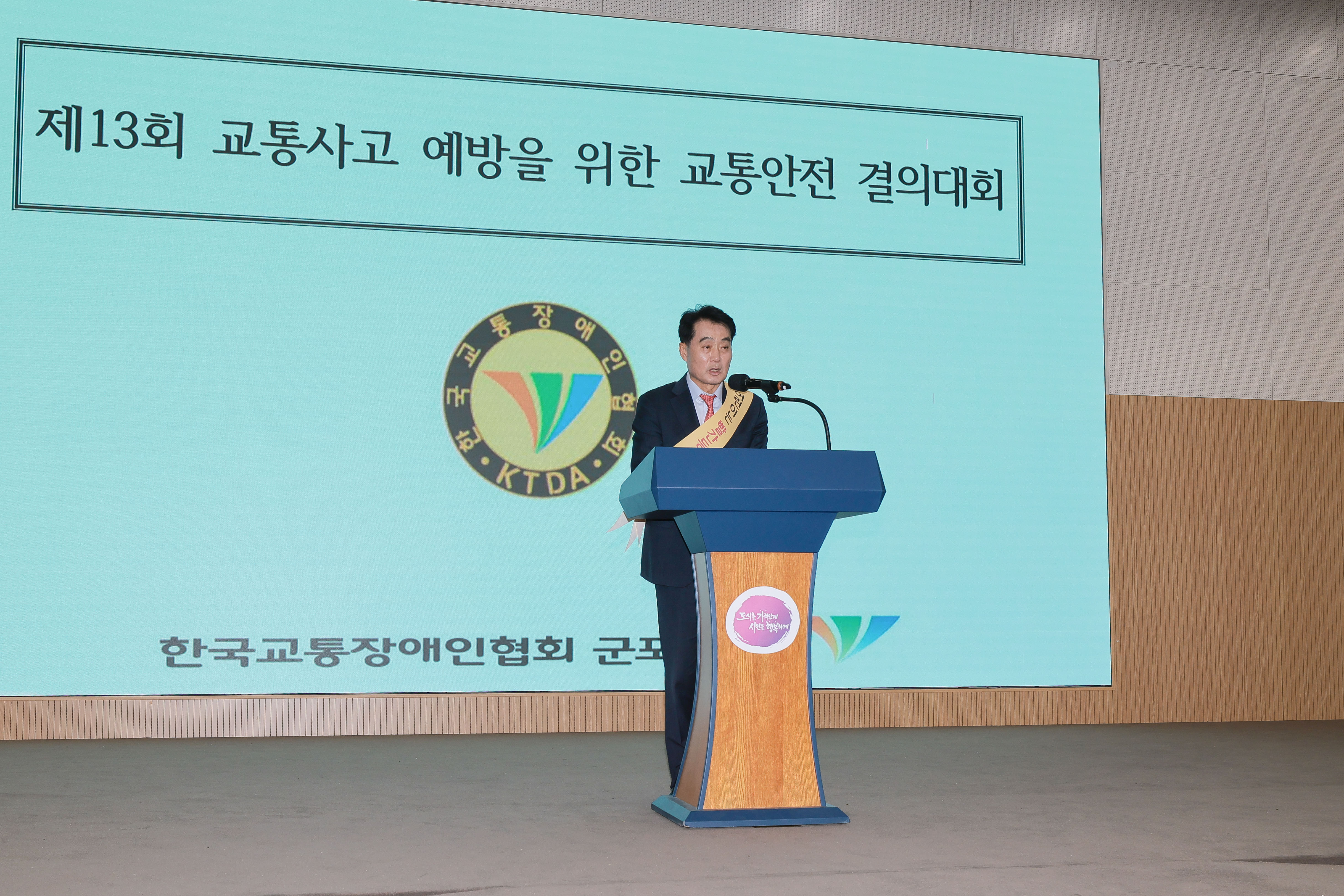 (사)한국교통장애인협회 군포시지회(지회장 장석규)는 10월 21일 군포시청 대회의실에서 ‘제13회 교통사고 예방을 위한 교통안전 결의대회’를 성황리에 개최했다. 이번 행사는 김병기 대외홍보부장의 사회로 진행됐다.