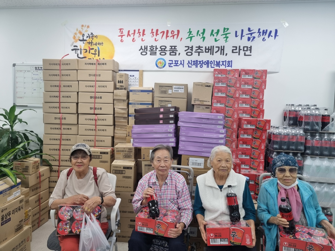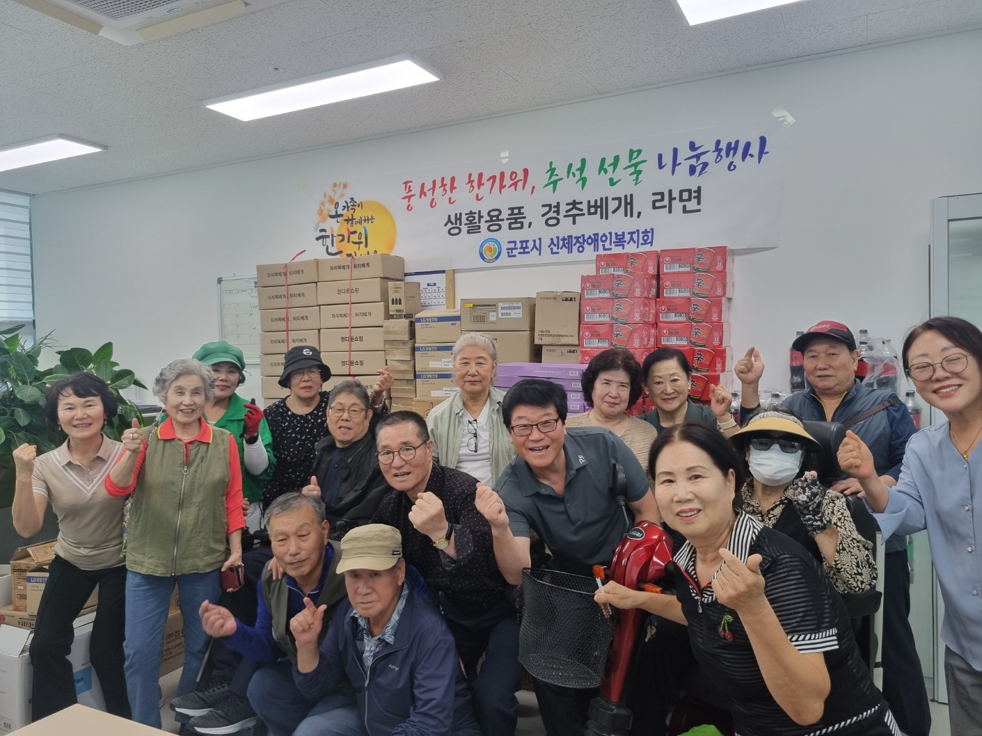 한가위를 맞아 군포시 신체장애인복지회에서는 회원분들께서 풍요로운 명절을 보내시기를 바라는 마음으로 추석선물을 마련, 나눔의 시간을 9월29일 오후2시에 복지회 사무실에서 가졌습니다.